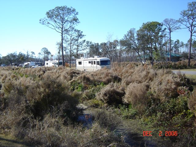 Our RV site at Gulf Shore, somewhat sparse due to salt water driven by Katrina, killing most of the trees.